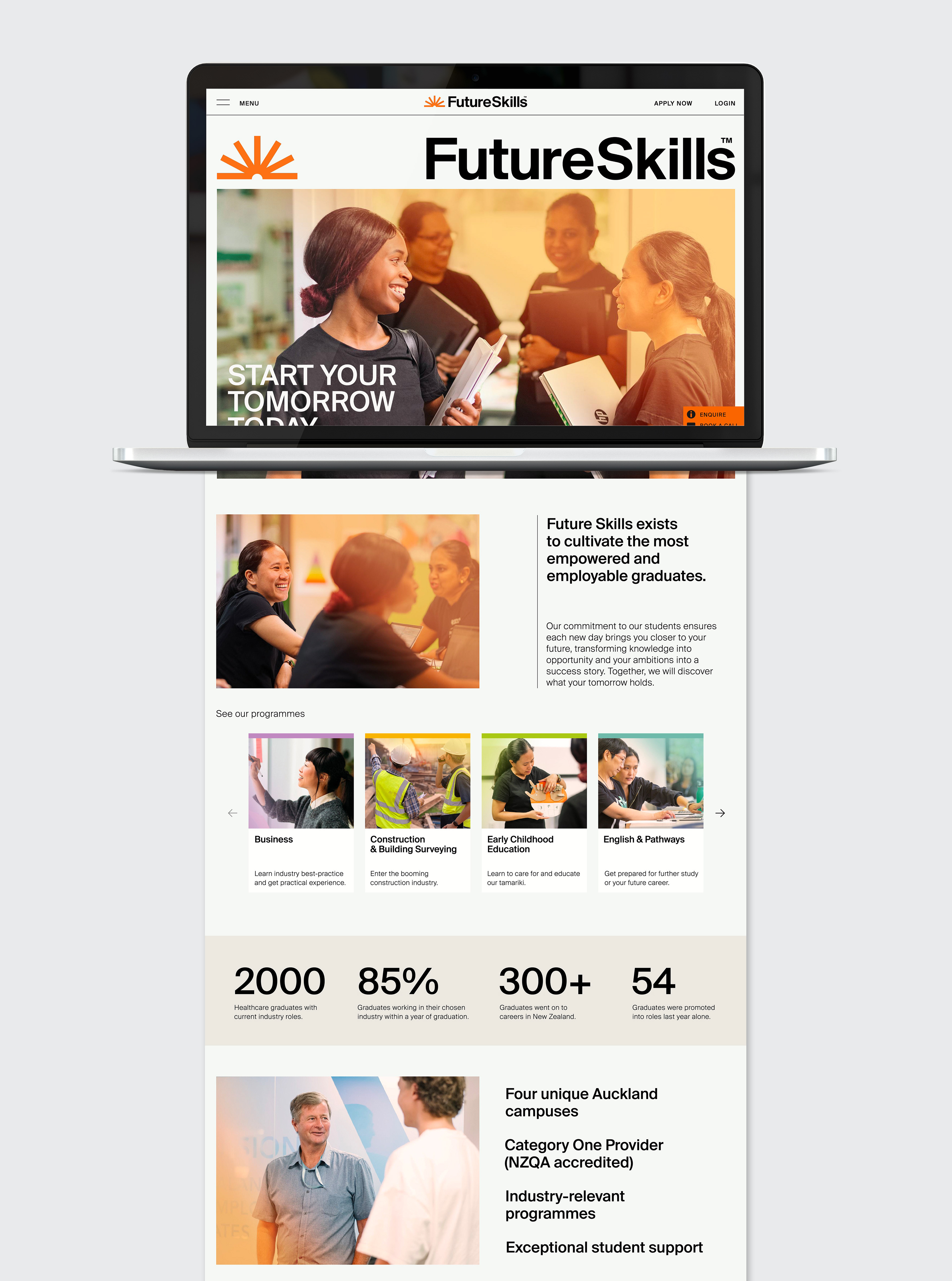 Future Skills have amazing online assets, from the external website to staff and student hubs and online learning and support tools. All of these needed to be updated with the new brand. The organisation was also growing to incorporate other sub brands like Ashton Warner Nanny Academy and partners like Otago Polytechnic Auckland International Campus. The brand needed to include a way to communicate this and provide space for more sub brands and partnerships in the future. And the future is looking bright.